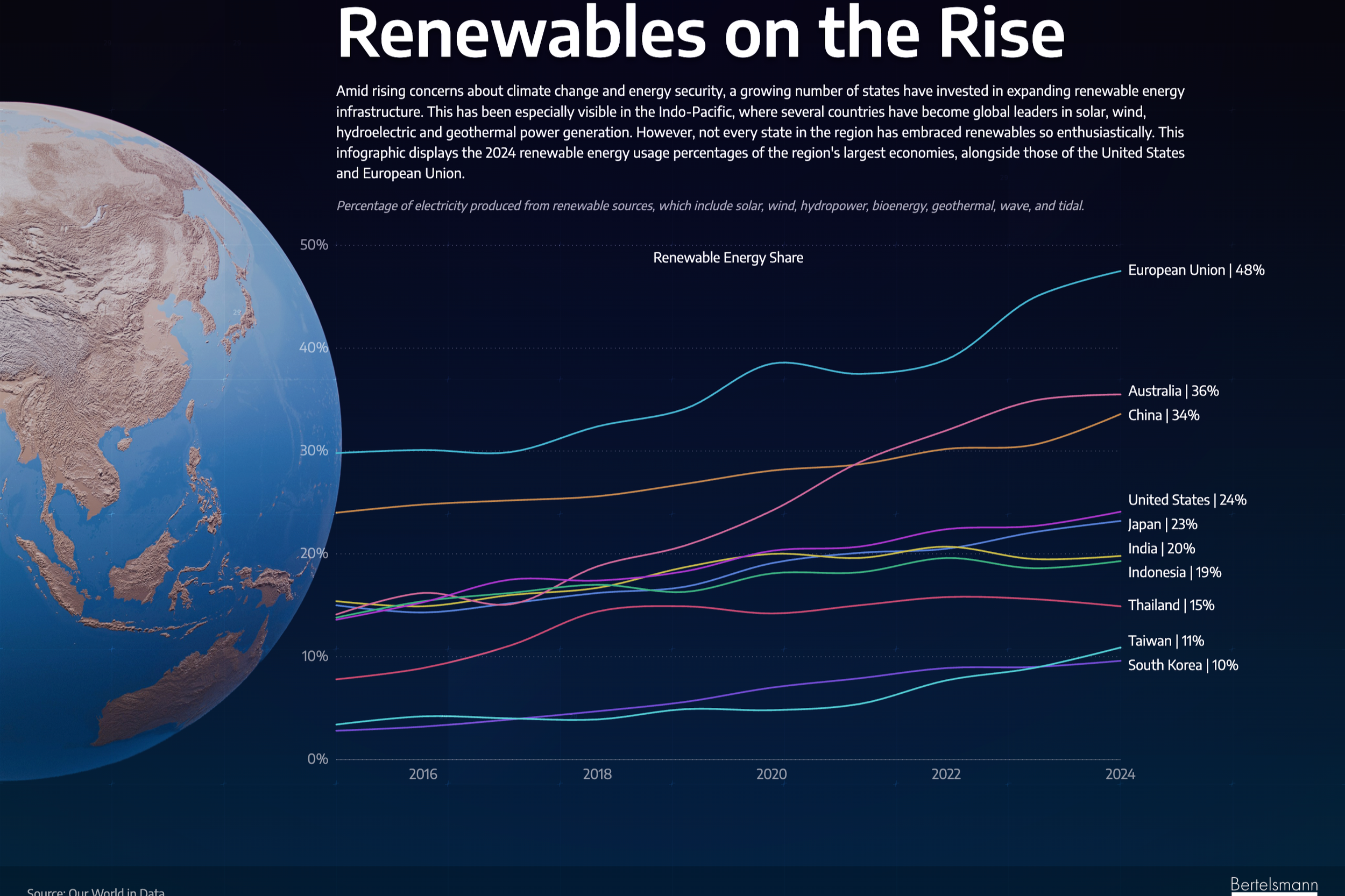 As climate pressures intensify and energy security becomes a strategic priority, many governments have accelerated investments in renewable energy capacity. This trend is particularly pronounced in the Indo-Pacific, where a number of countries now rank among the world’s leading producers of solar, wind, hydropower, and geothermal energy. Yet the transition has not unfolded evenly across the region; some states have moved more cautiously than others. This infographic compares 2024 renewable energy consumption shares among the Indo-Pacific’s largest economies, alongside figures for the United States and the European Union. Click on the infographic for an interactive version.